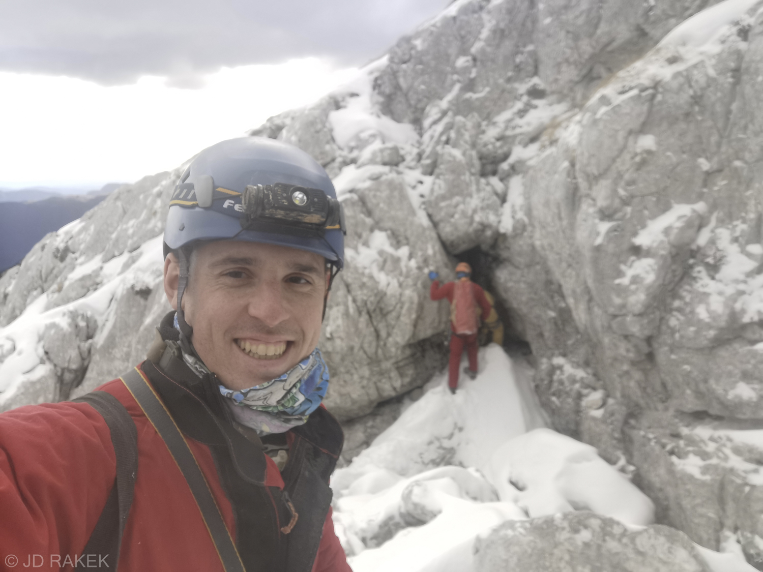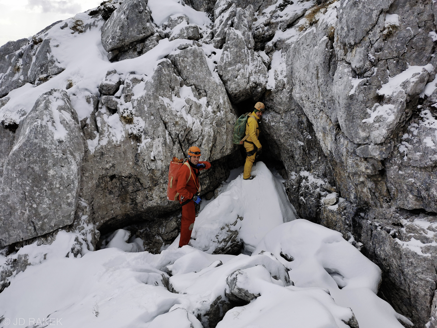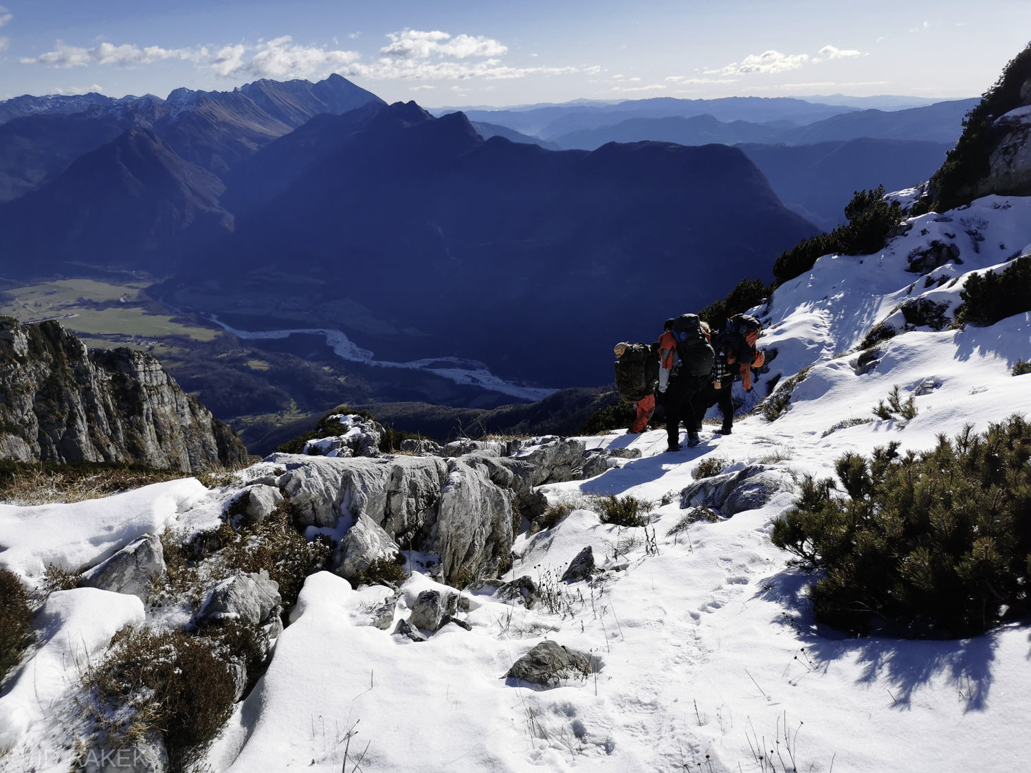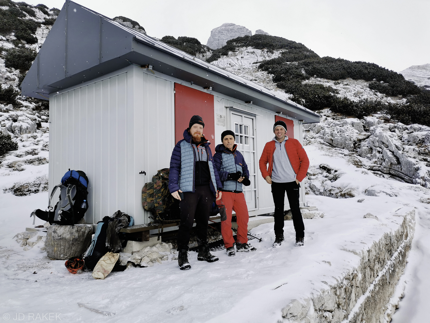 Odločitev je padla in tako sva se z Mihom v soboto 25.11. 2023 ob 5:15 napotila proti Ajdovščini, kjer smo “presedlali konje”, krmilo kočije proti Bovcu pa je prevzel Božo. Po poti smo v Novi Gorici pobrali še Patrika. Kot veleva tradicija sem prespal dobršni del poti in okoli 8 ure zjutraj smo že srebali kavo v Bovcu. Cesta od B postaje do izhodišča je bila po nedavnih padavinah dokaj znosna; Miha je moral enkrat iz avta ter zasuti in z lopato utrditi zgolj en jarek, da smo lahko nadaljevali pot proti izhodišču. Nekje med 9 in pol 10 uro smo že lepo otovorjeni z zmernim tempom korakali proti breznu. Sprva napovedano sončno vreme se je v Bovcu izkazalo za napačno. Nebo je bilo zaprto z oblaki, preden smo zagrizli v hrib pa je začelo celo snežiti, tako da smo bili malo v dilemi ali vzamemo sabo tudi cepin in dereze. Malo pred staro kočo Petra Skalarja se je vreme umirilo in ko smo dosegli vhod v brezno je posijalo sonce in zimska kulisa je bila prekrasna.