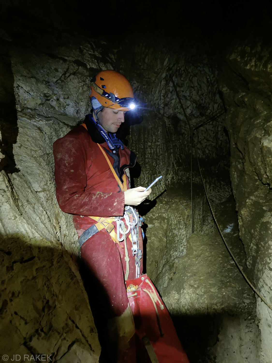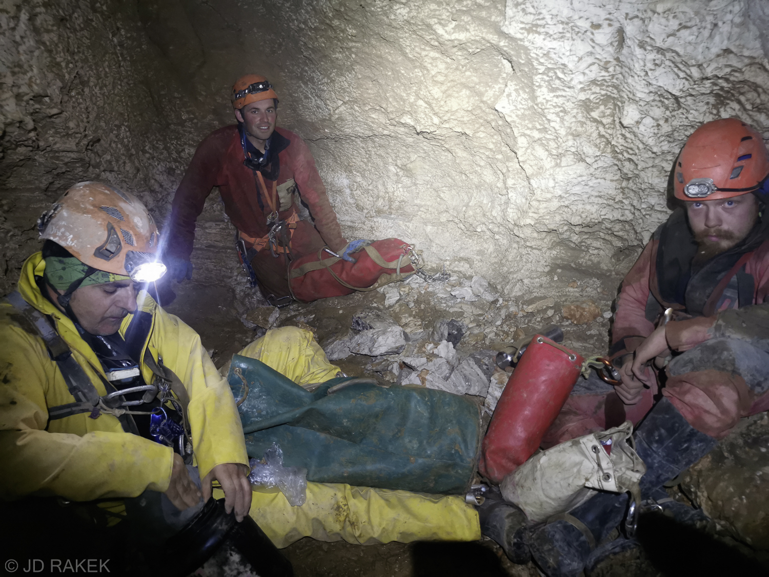 Ob pol 1 popoldne smo se odpravili v jamo in ob 15:00 smo že bili na dnu brezna “Gre Gre” (-400). Tu smo se razdelili na dve skupini: Jaz in Božo sva odšla opremljat novo brezno na koncu meandra, kjer so končali na prejšnji akciji, Miha in Patrik pa sta nama sledila ter hkrati opravljala meritve meandra in novih delov.