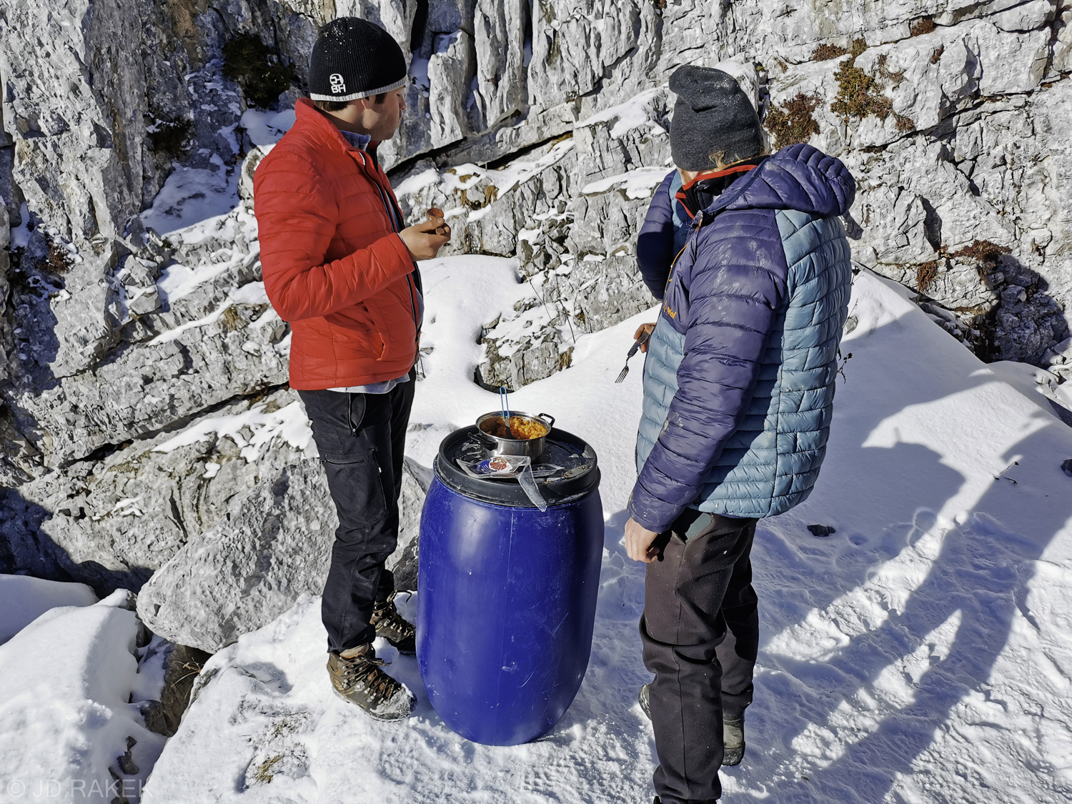 Lepo vreme nas je okoli 8 ure zjutraj spravilo iz spalnih vreč in šotora. Pripravili smo kavo in pospravili tabor. Hkrati smo tudi poskrbeli, da nadaljnjim odpravam ne bo potrebno okušati Božotovega žganja. Miha je za zajtrk pripravil še pašto in tako okrepčani smo se odpravili v dolino.