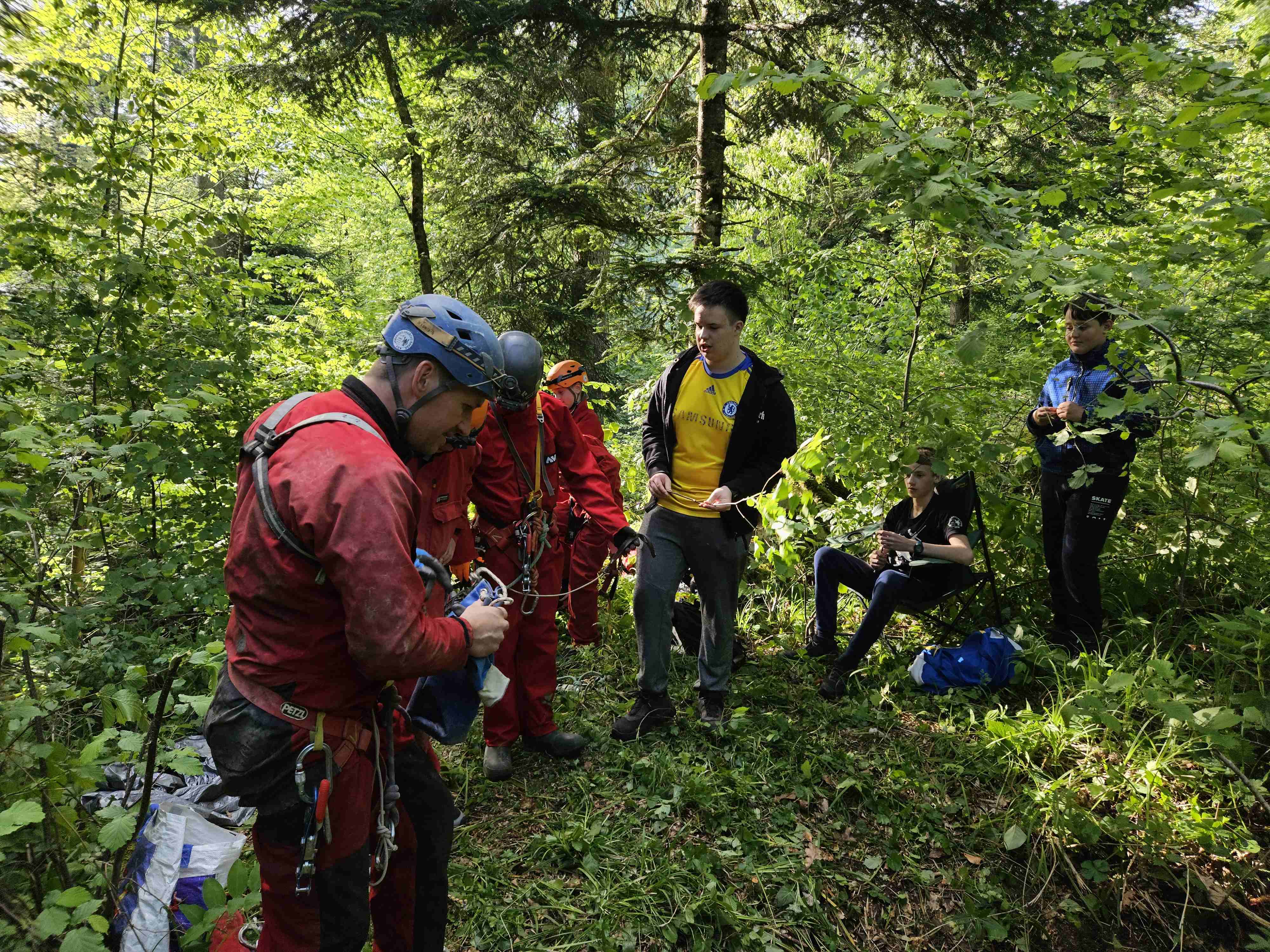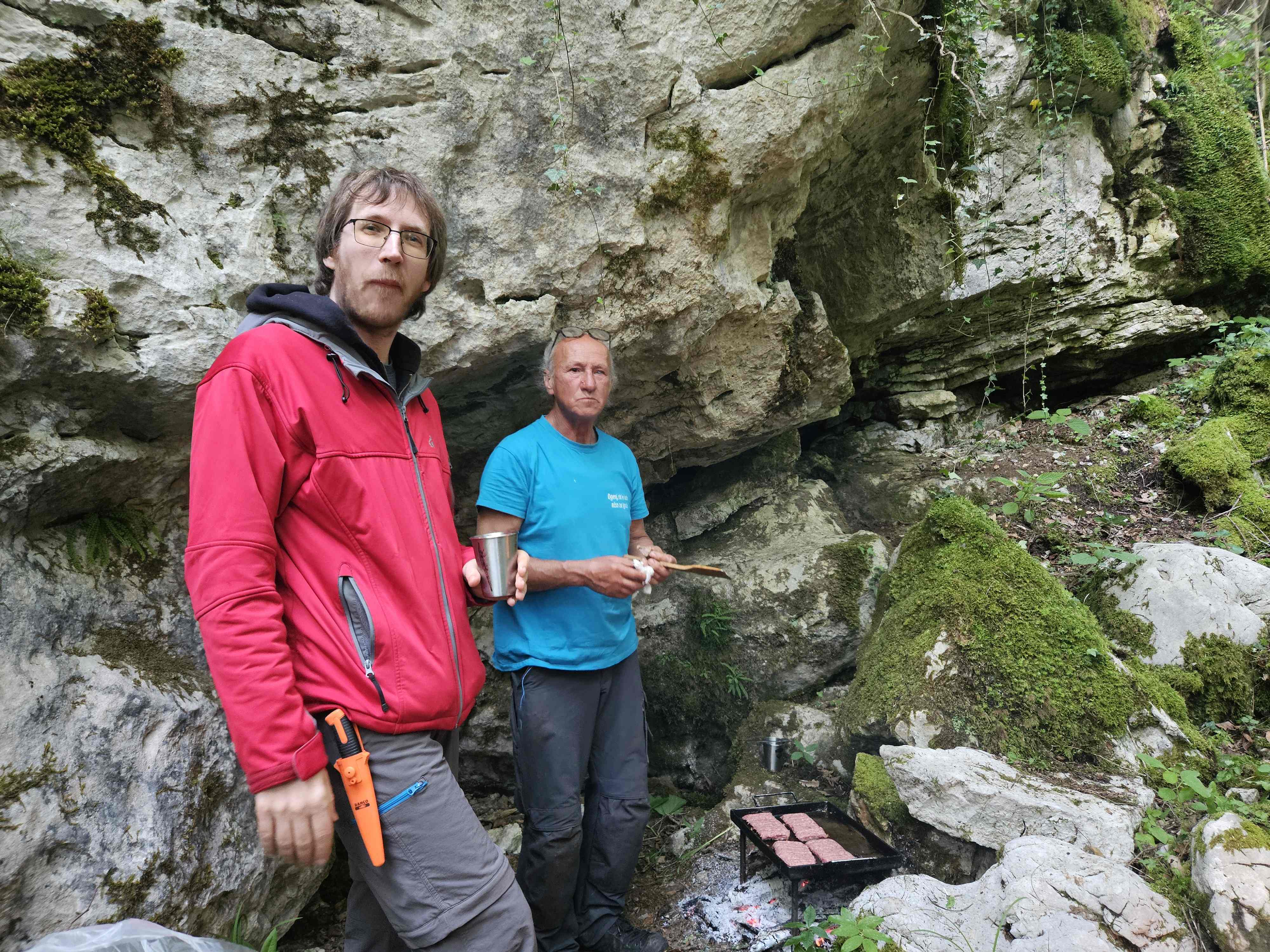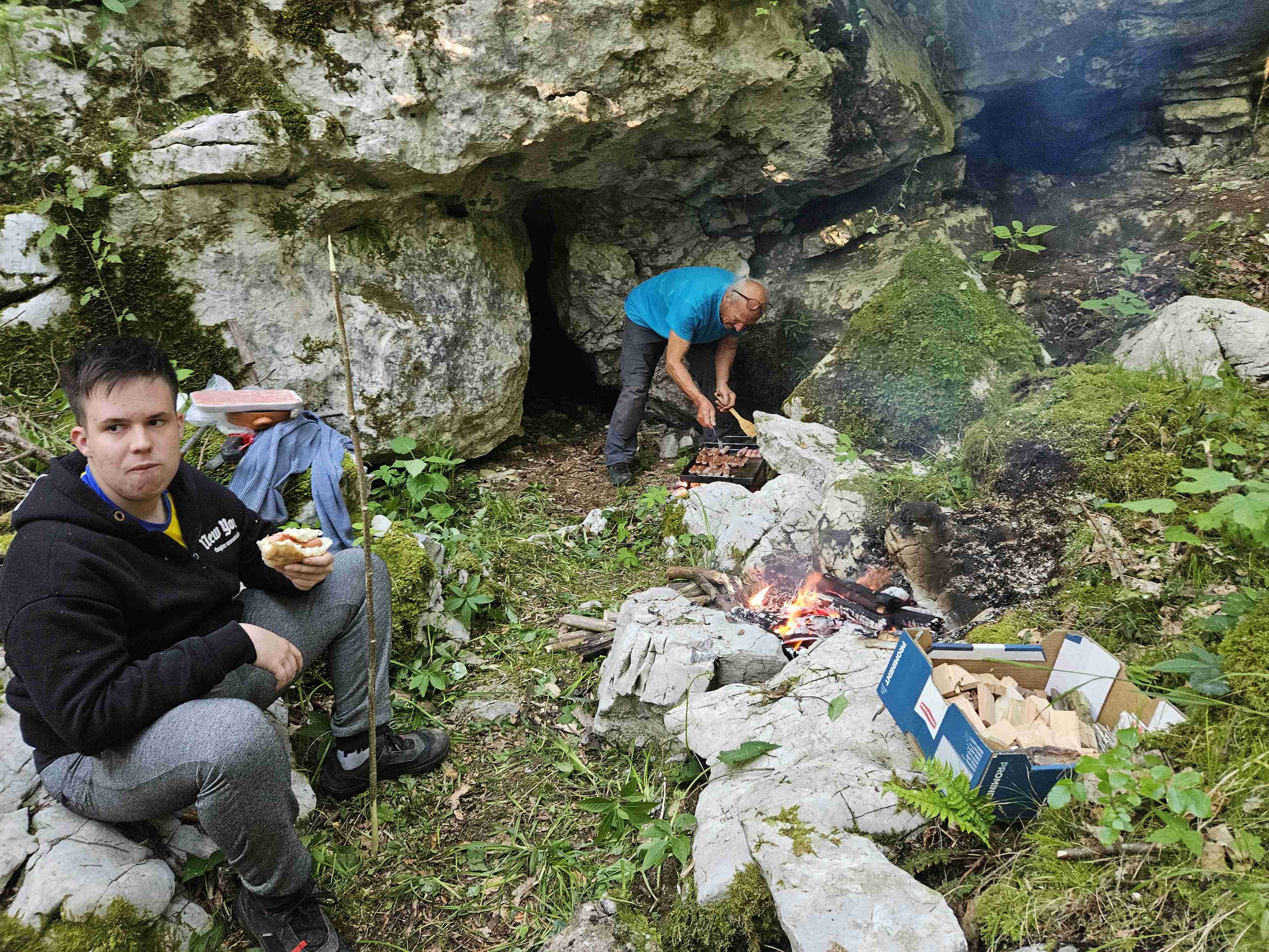 Kot ponavadi smo se zbrali pred klubom, in se razporedili po avtih. Pridemo do opuščenega ovinka ceste od Zelš proti Rakovem Škocjanu, ki se zdaj že zarašča. Tam je zanimiv spodmol, naša bazna lokacija. Ivan se je lotil priprave na žar, ostali pa smo šli v novo jamo. GPS nas je imel za norca. Prehodili smo vse grmovje naokrog, vendar je v resnici vhod čisto blizu. Ko smo ga našli pred enim mesecem, je bilo še vse brez listja. Jama ima vhodno brezno globoko 6m in potem še 8m dolg prostor. Nekaj je kapnikov in eno okostje srnjaka z rogovi. Vse smo pustili lepo tam, jamo izmerili in šli na čevapčiče. Za domov smo bili že malo pozni, saj je padla odločitev da se speče še tretjič. Miha in Hiti sta medtem raziskala drugo novo tik ob cesti, tudi ta je bolj kratka, ima pa kapnike.