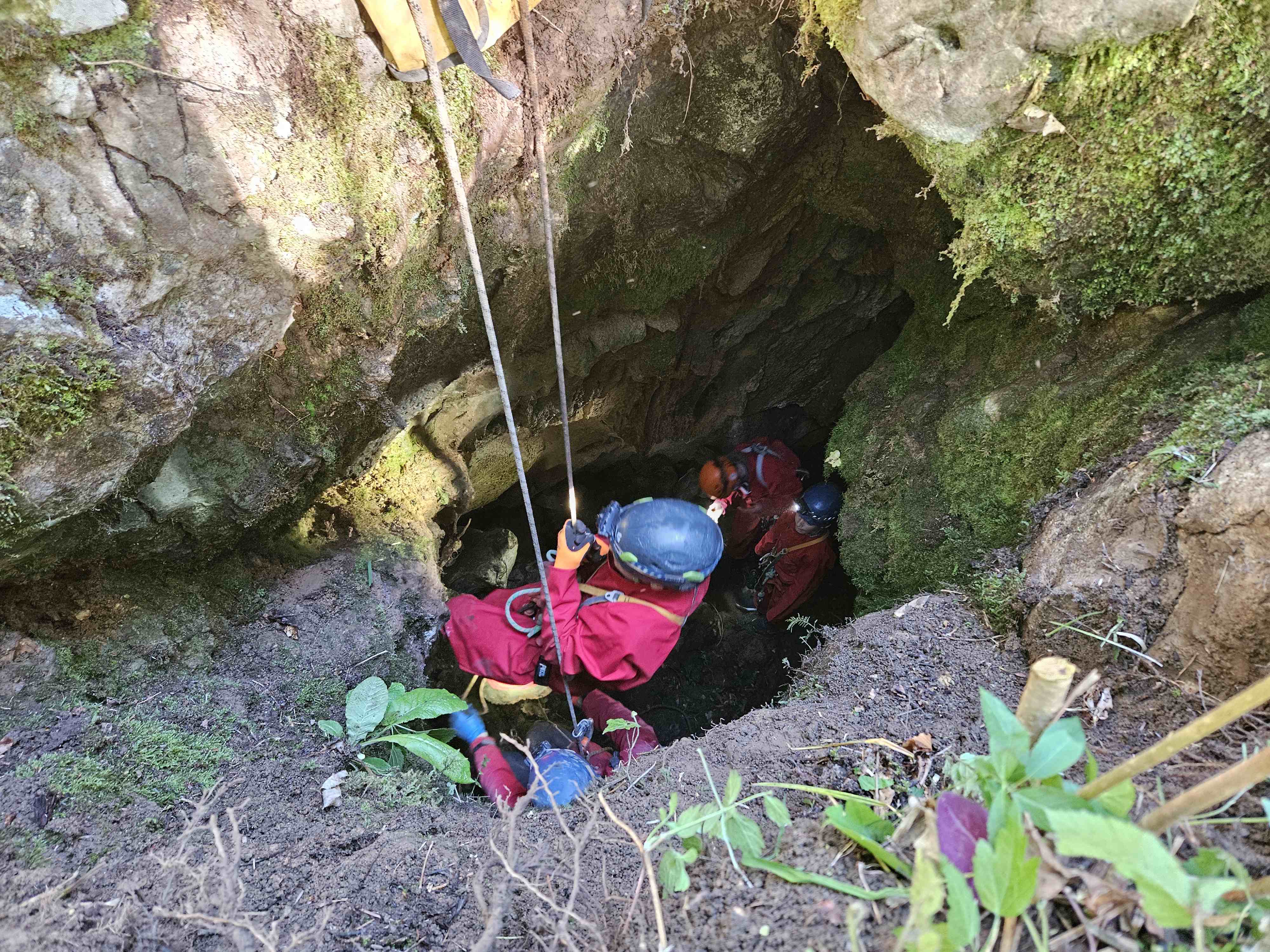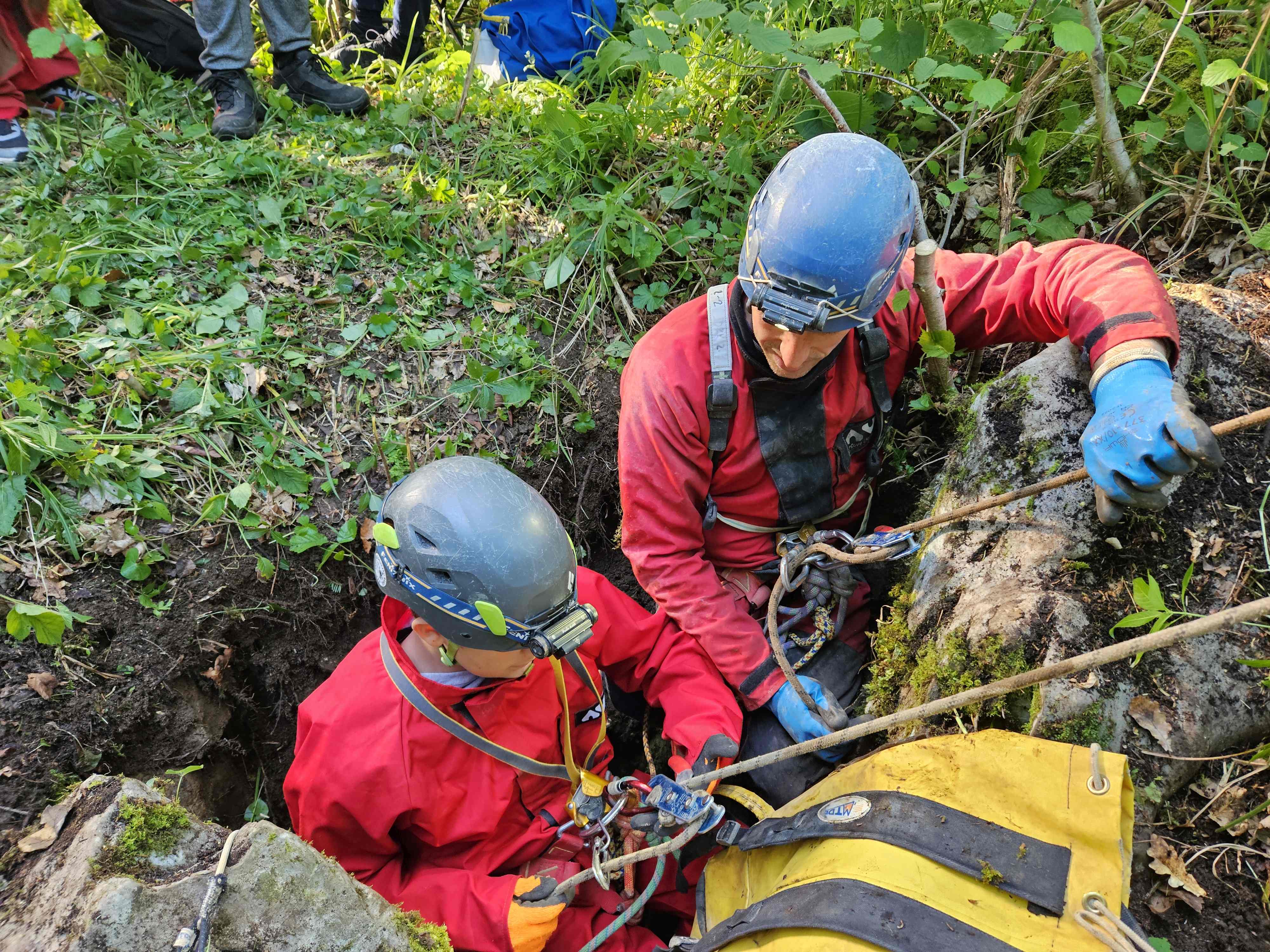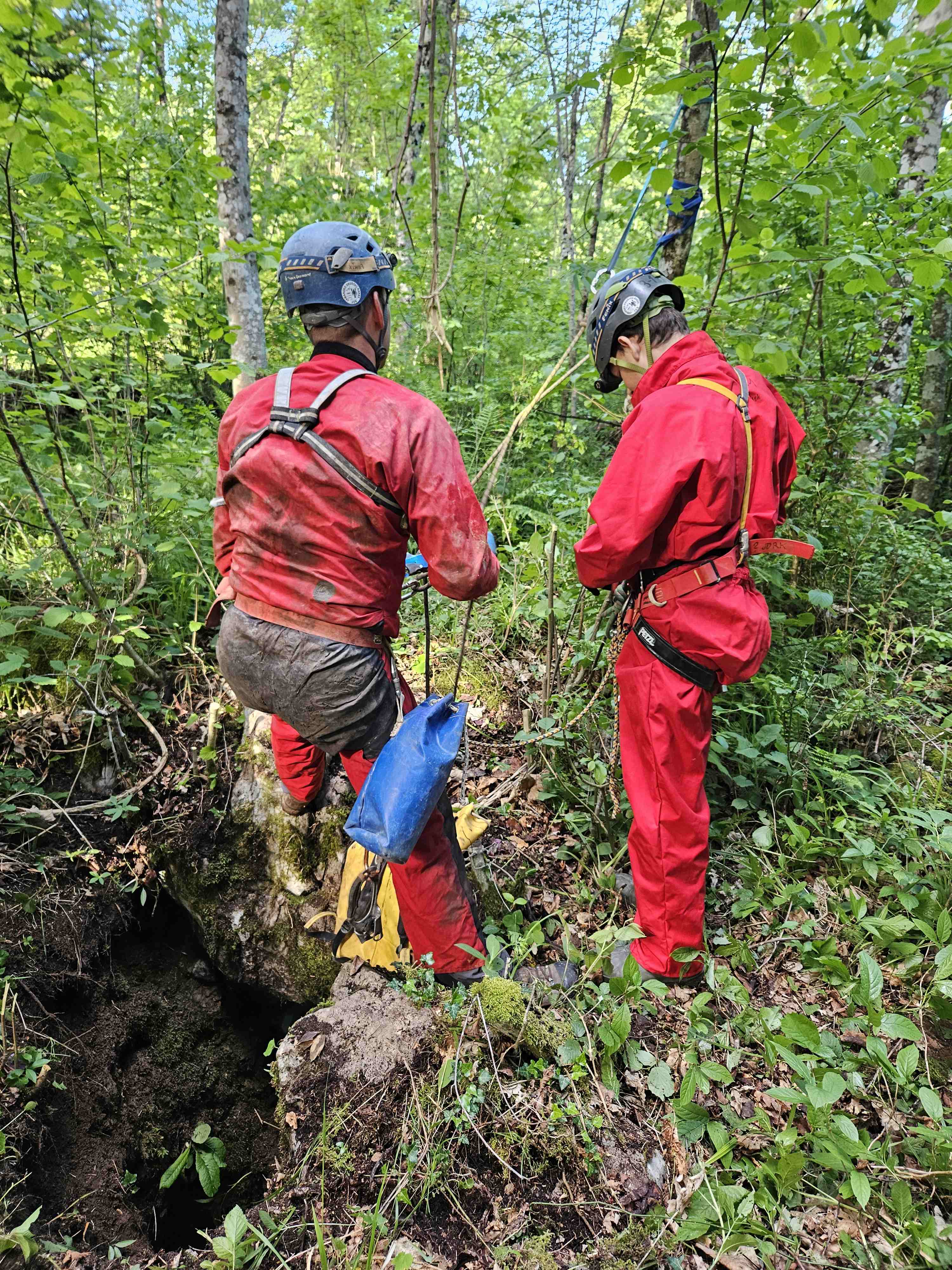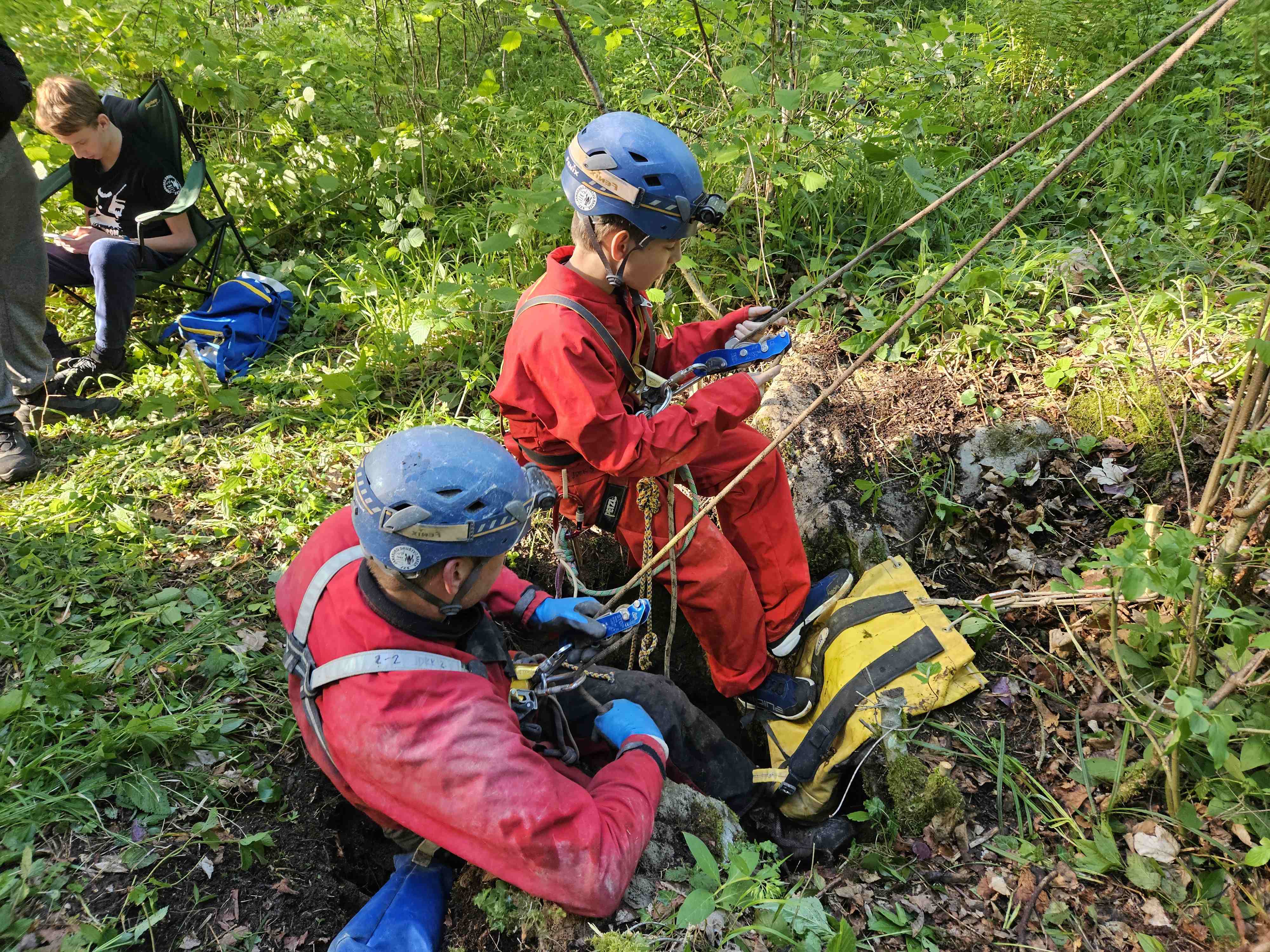Kot ponavadi smo se zbrali pred klubom, in se razporedili po avtih. Pridemo do opuščenega ovinka ceste od Zelš proti Rakovem Škocjanu, ki se zdaj že zarašča. Tam je zanimiv spodmol, naša bazna lokacija. Ivan se je lotil priprave na žar, ostali pa smo šli v novo jamo. GPS nas je imel za norca. Prehodili smo vse grmovje naokrog, vendar je v resnici vhod čisto blizu. Ko smo ga našli pred enim mesecem, je bilo še vse brez listja. Jama ima vhodno brezno globoko 6m in potem še 8m dolg prostor. Nekaj je kapnikov in eno okostje srnjaka z rogovi. Vse smo pustili lepo tam, jamo izmerili in šli na čevapčiče. Za domov smo bili že malo pozni, saj je padla odločitev da se speče še tretjič. Miha in Hiti sta medtem raziskala drugo novo tik ob cesti, tudi ta je bolj kratka, ima pa kapnike.